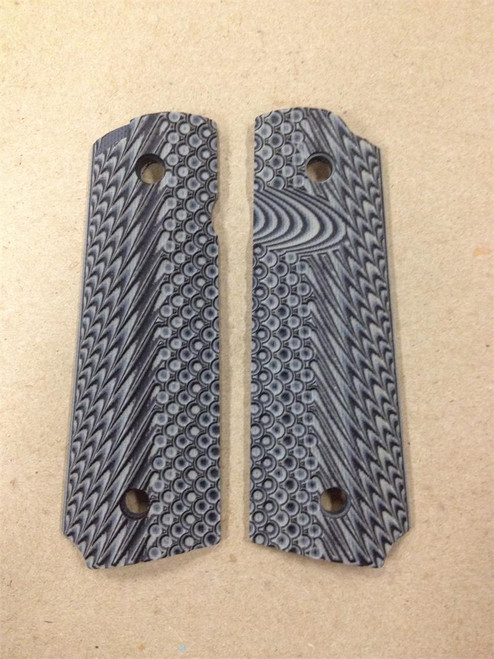Beautifully crafted Micarta grips with maximum grip friction retention for the hand. The outside of the grip is machined with a variety of geometric patterns which are pleasing to the eye and yet completely effective at holding your palm in position for firing. Looks sharp when installed on the 1911 pistol.